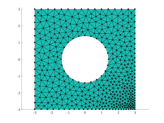 figure(1); clf; mp_plot_mesh(gca, nodes, elements); axis('equal') saveas(gcf(), 'circ_hole.png'); % Register demo status mp_manage_demos('report', 'circ_hole_mesh', true);