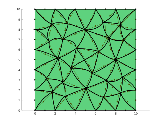 for i=1:mesh.countElems() nodes = mesh.elemNodes(i); nen = length(nodes); pairs = combnk(1:nen, 2); for p = pairs' n = nodes(p); nodesDist = norm(diff(mesh.nodes(n,:), 1)); radius(n) = min(radius(n), nodesDist*[1;1]); end end radius = 0.3*radius; radius(boundaryNodes) = 0.0; direction = 2*pi*rand(mesh.countNodes(), 1); distance = radius.*(0.5+0.5*rand(mesh.countNodes(),1)); u = distance.*[cos(direction), sin(direction)]; gmap = mesh.geomTrans(); quadrature = mp.IM.Triangle(2); s = 0.0; for i=1:mesh.countPerDim(mesh.dim) J = gmap.volumeForm(quadrature.pts, i, u); s = s+dot(J,quadrature.w); end fprintf('Integral : %g\n', s); viewer = mp.Viewer(); viewer.show(mesh); h = viewer.plot_curved_elements(mesh, 10, u); alpha(get(h, 'Children'), 0.3) set(get(h, 'Children'), 'LineWidth', 2) % Report demo status mp_manage_demos('report', 'integrate', true);