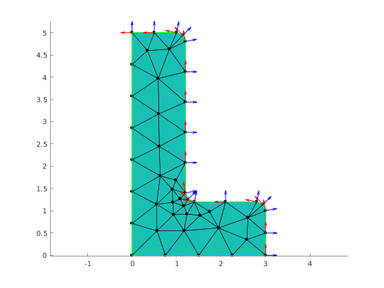 % Plot arrows for tangent and normal vectors hold on; quiver(mesh.nodes(:,1), mesh.nodes(:,2), nodeTan(:,1), nodeTan(:,2), 0.3, 'LineWidth', 1, 'Color', 'red'); quiver(mesh.nodes(:,1), mesh.nodes(:,2), nodeNor(:,1), nodeNor(:,2), 0.3, 'LineWidth', 1, 'Color', 'blue');